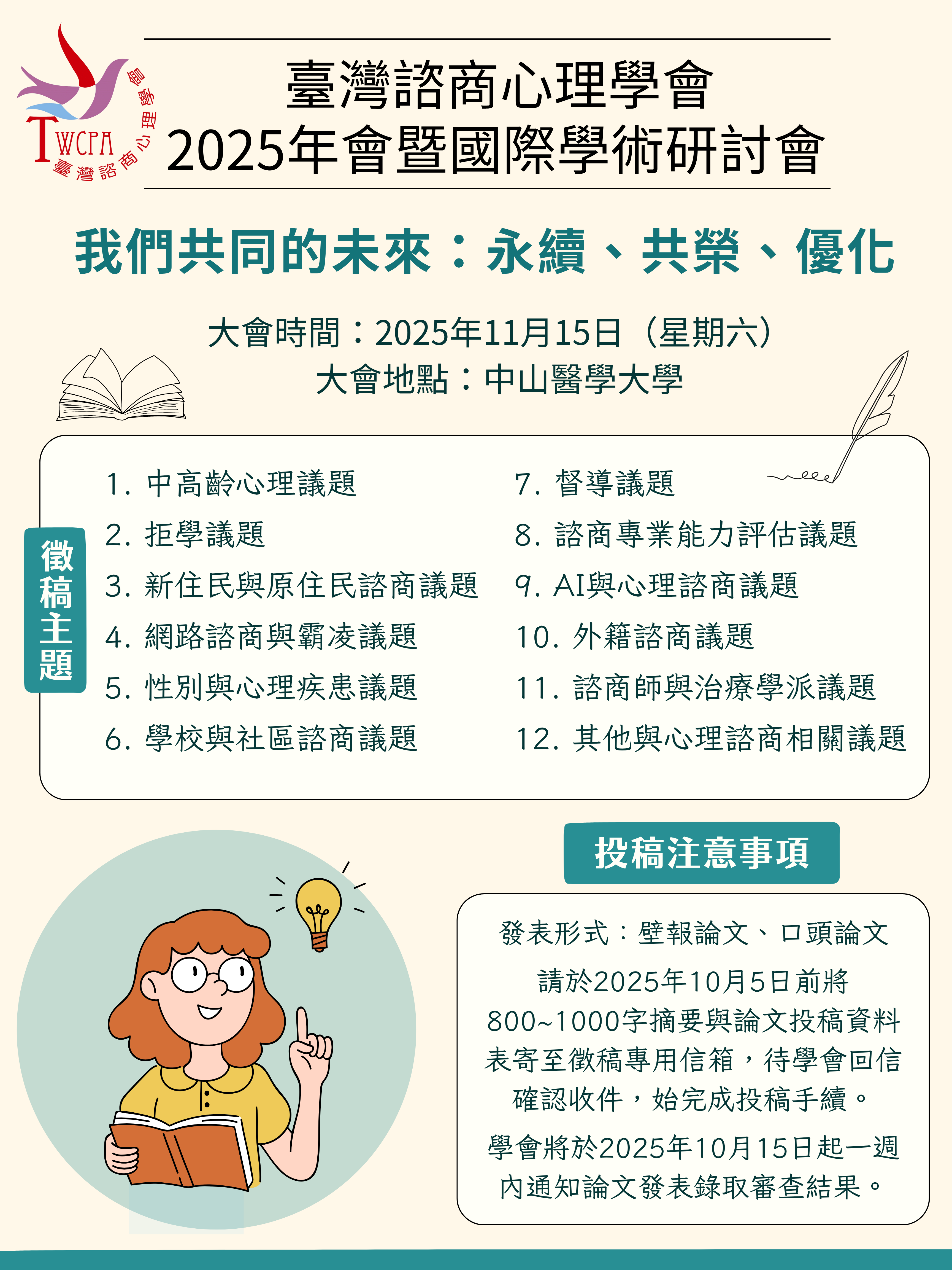 本會一年一度的年會暨國際學術研討會將於11月15日於中山醫學 大學舉辦,我們誠摯邀請您參與本次年會的論文徵稿與發表, 相信您的參與將為活動增添更多精彩內容, 也有助於促進實務與學術間的對話與連結。