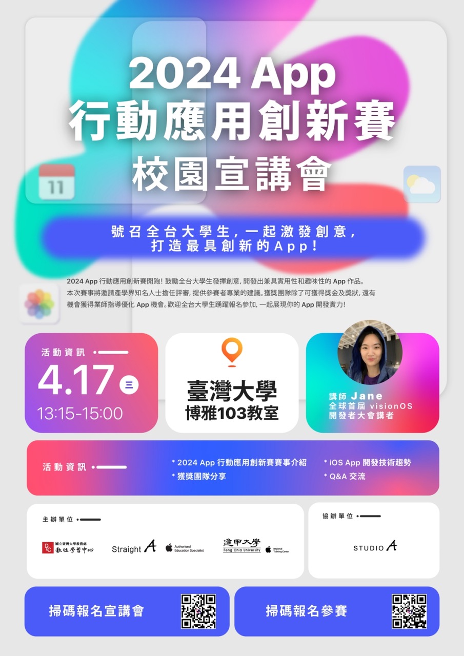 「APP移動應用創新賽」,是Apple認證全台最大iOS App競賽,為持續鼓勵全台大學生加入程式設計行列, 臺灣大學數位學習中心、逢甲大學 Apple 區域教育培訓中心與 Straight A 晶盛科技繼續攜手合作,舉辦 Apple 「第八屆 App 行動應用創新賽」,本屆全台將遴選出前三名決賽隊伍, 以參加浙江大學舉辦之大中華區「2024 年 App 行動應用創新賽」總決賽,以取得最大殊榮。 誠摯邀約各大學師生組成跨系、跨校、跨國聯隊, 參與一年一度最盛大 App 競賽,讓台灣校園團隊展現優異的能力, 透過與各地團隊的交流與相互學習, 進而培育更多程式設計人才在國際舞台上發光發熱!