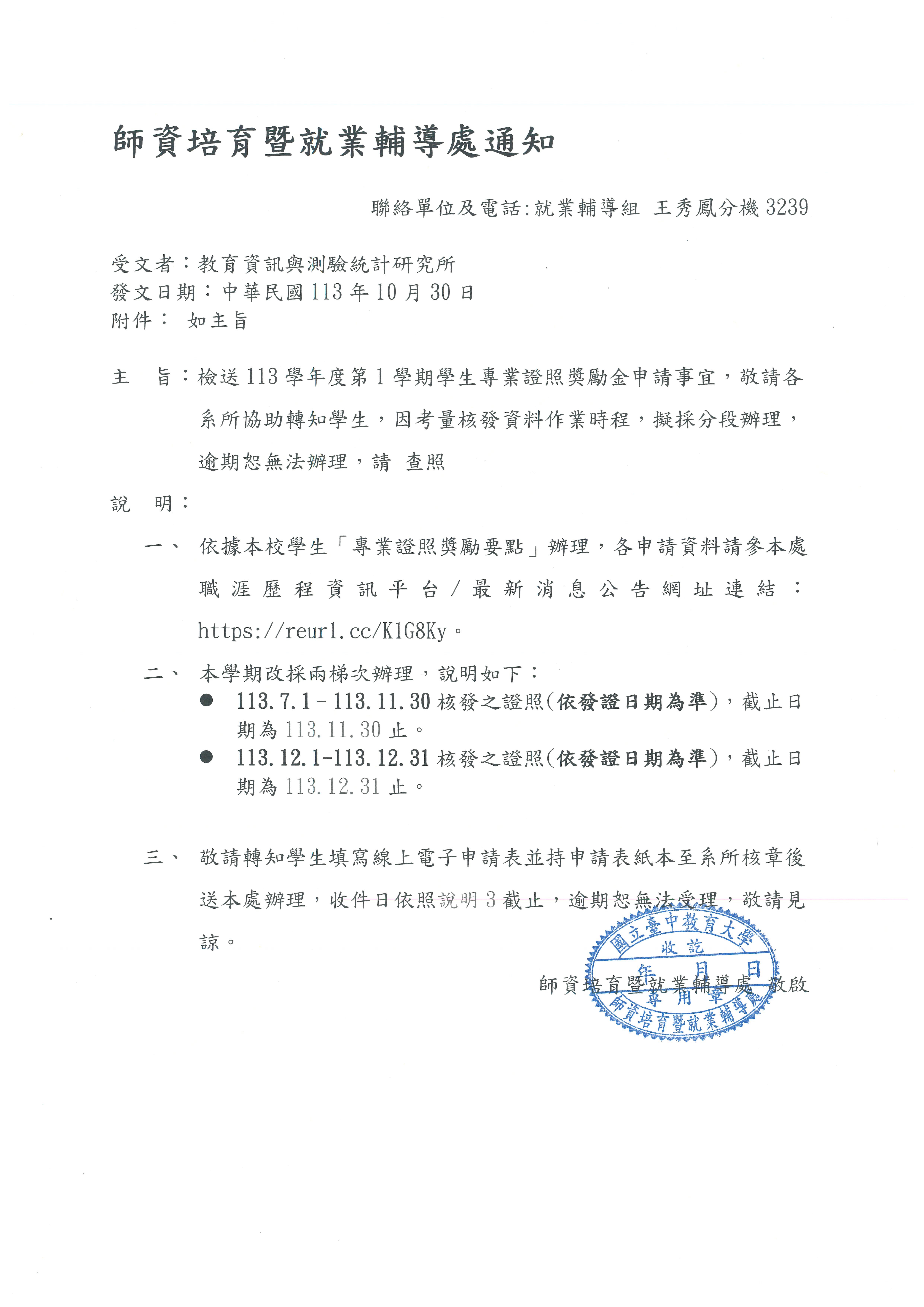 - 113.7.1–113.11.30核發之證照(依發證日期為準),截止日期為113.11.30止。