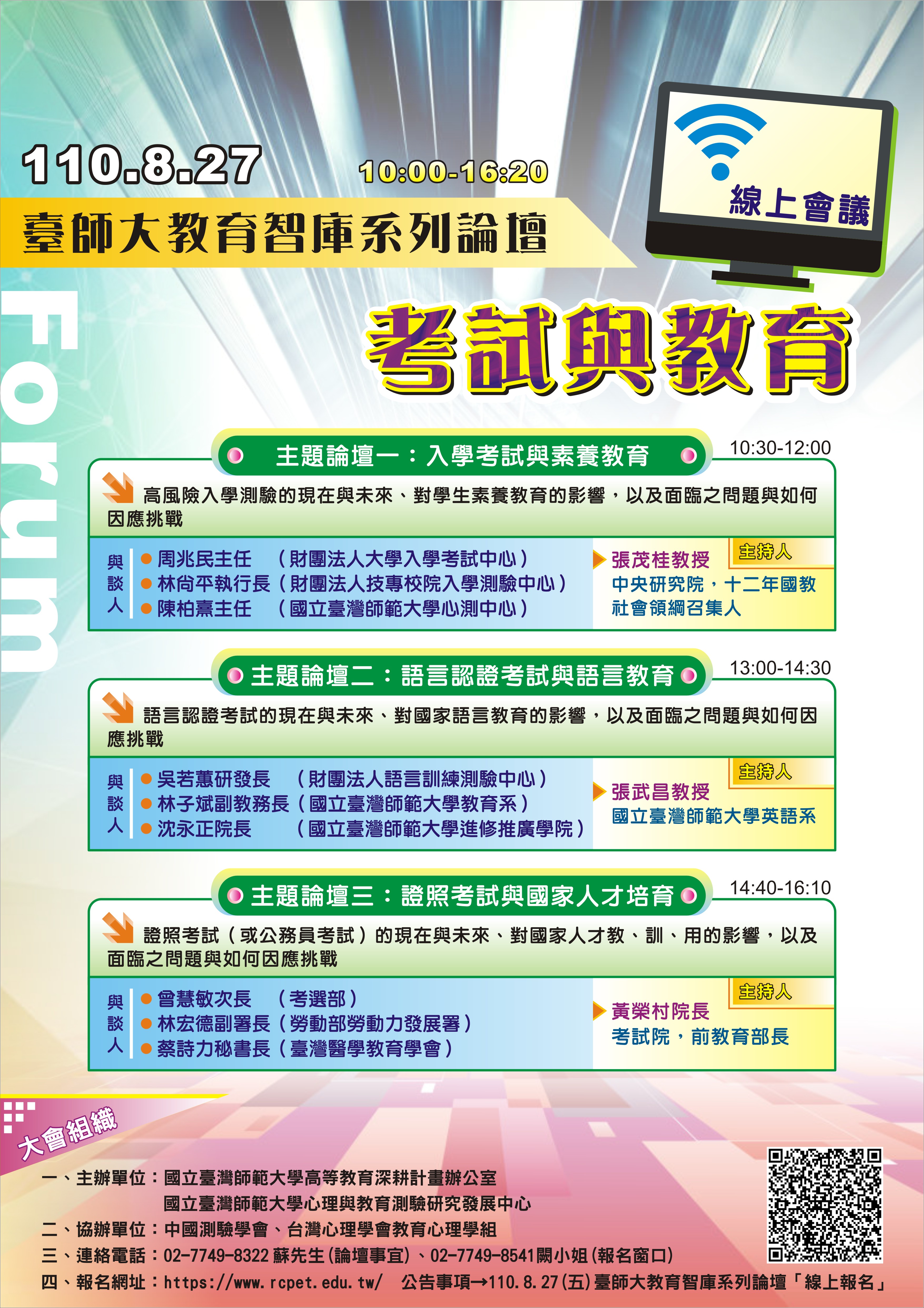 「國立臺灣師範大學教育智庫系列論壇—考試與教育」將於110年