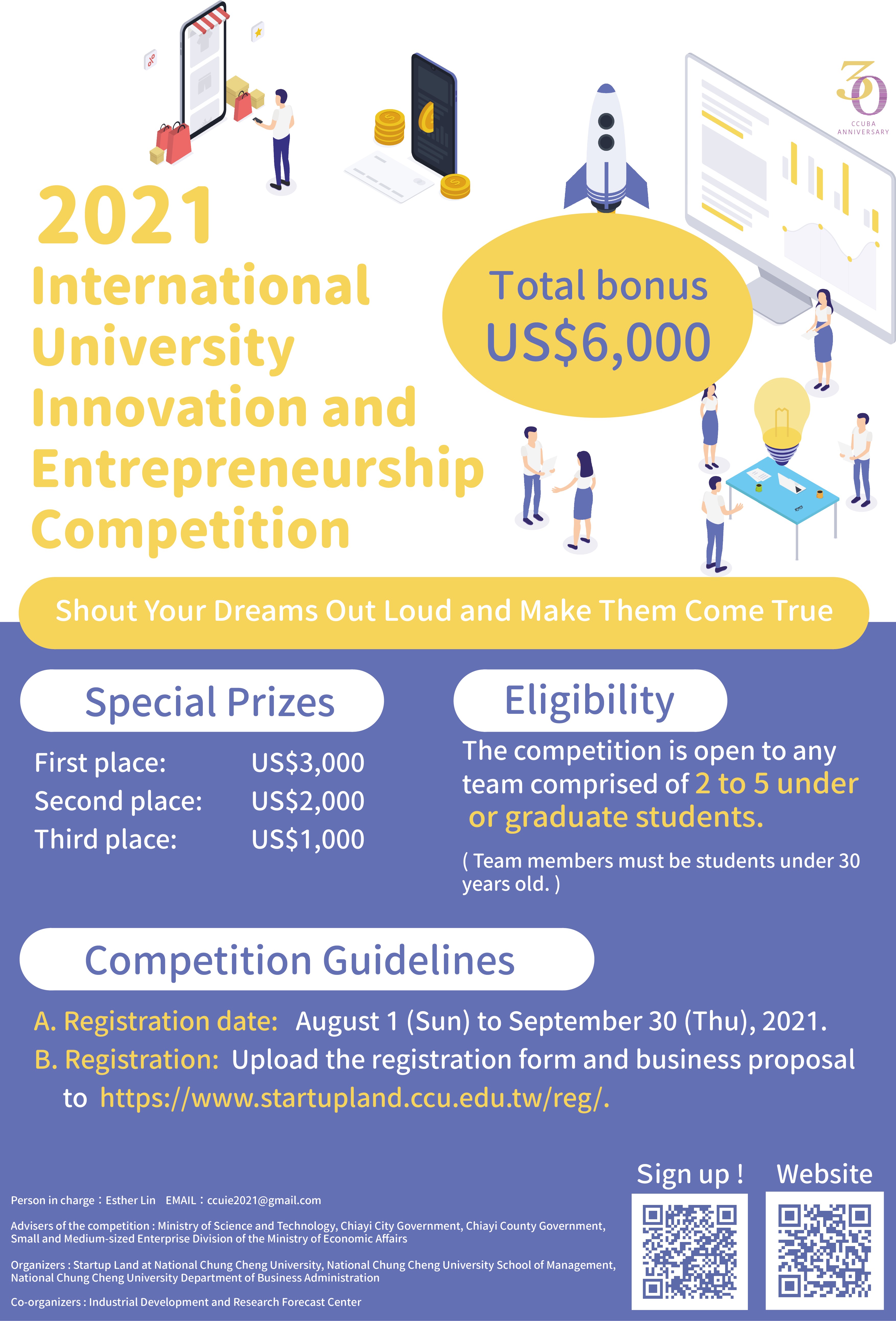 為提升學生創新創業之風氣,培養商業構思與團隊合作的能力,國立中正大學舉辦「2021創新創業競賽-築夢踏實,造夢成真」邀請各大專院校的學生一同Start up!成為夢想的自造者!