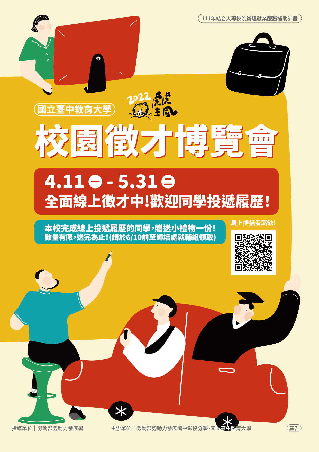 一、本校「2022虎虎生風校園徵才博覽會」改為線上徵才,取消5月12日實體就業徵才媒合活動。本次徵才廠商含公部門、文教業、服務業、資訊科技、製造業及金融保險業等,提供計2,000多個職缺。 二、活動網址:https://reurl.cc/nEWoNv,線上徵才期間:即日起至5月31日。