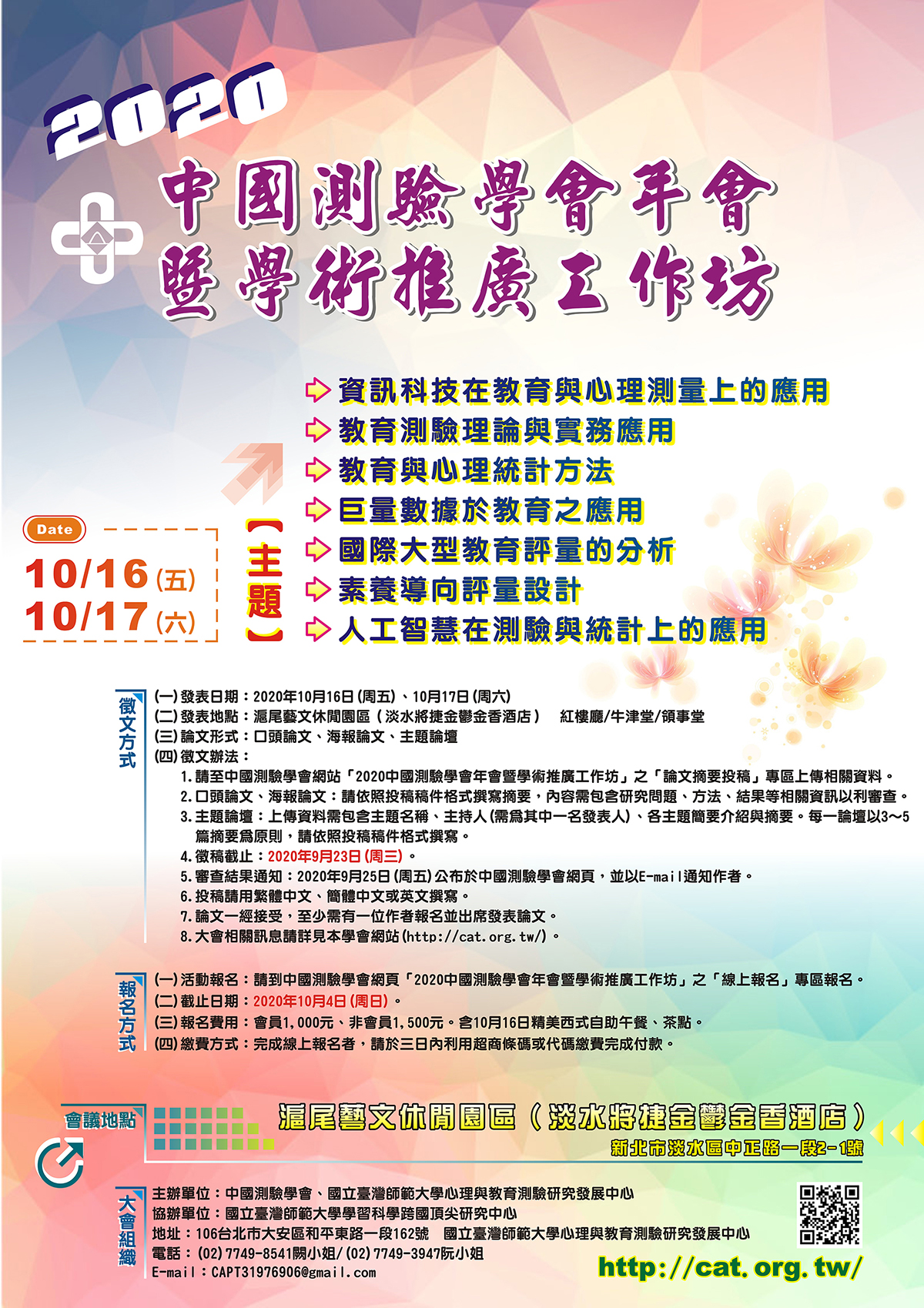 本年度中國測驗學會年會暨學術推廣工作坊謹訂於109年10月16日(五)、17日(六),假「滬尾藝文休閒園區(淡水將捷金鬱金香酒店)」(新北市淡水區中正路一段2號)召開,歡迎教育先進撥冗出席。論文徵求至9月23日(三)截止,歡迎各系所學生踴躍賜稿!詳情請參閱附件海報及本學會網頁(http://cat.org.tw/)。