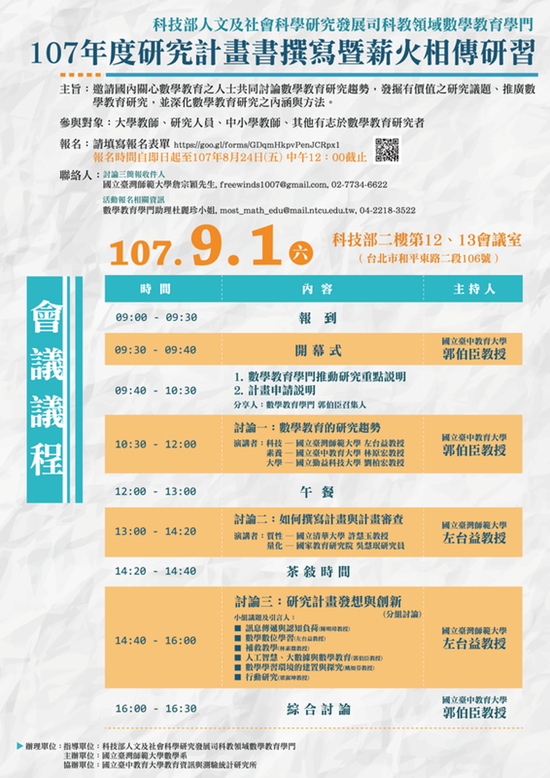 數學教育學門助理杜麗珍小姐, most_math_edu@mail.ntcu.edu.tw, 04-2218-3522 (活動報名相關資訊)
